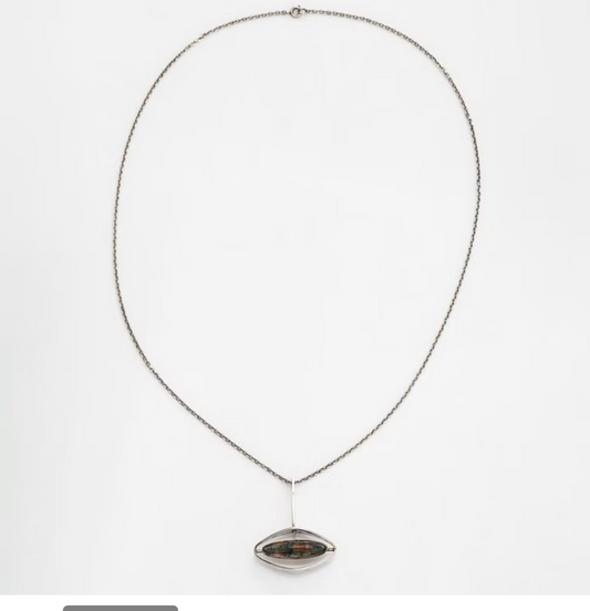 Elis Kauppi, a silver necklace with moss agate spinning pendant