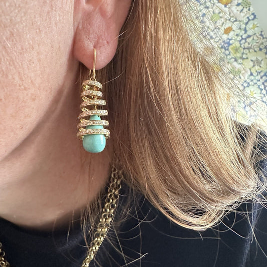 18K Gold , Turquoise And Diamond Dangle Earrings 1.75”