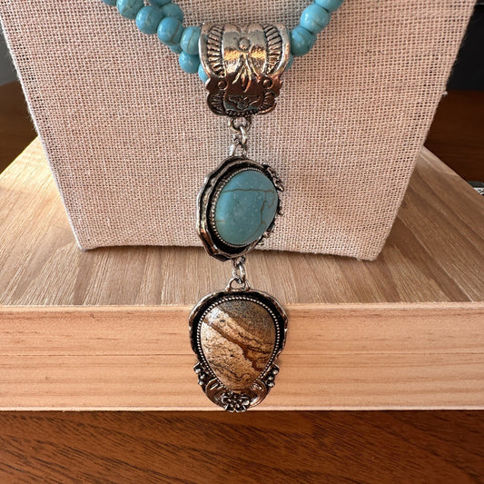 Turquoise Colored stone beaded necklace with large teardrop shape pendant