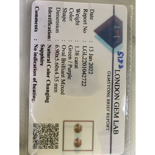 1.38 ct CERTIFIED NO HEAT COLOR CHANGE GreenPURPLE Natural Sapphire LOOSE