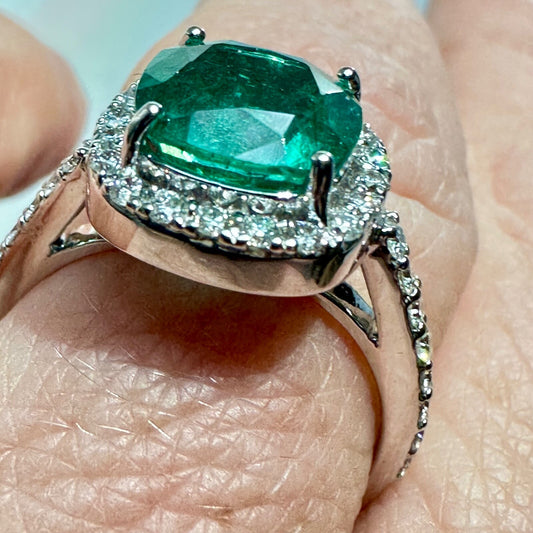 18k Old Cushion Cut Emerald Diamond Ring GIA Report
