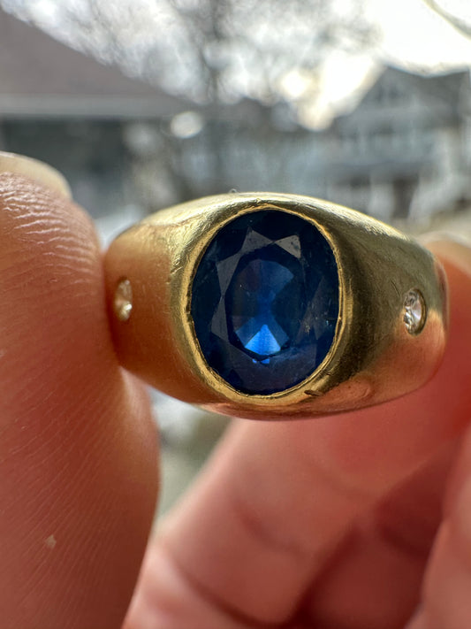 Vintage 18k flush mount gypsy style natural sapphire and diamond ring