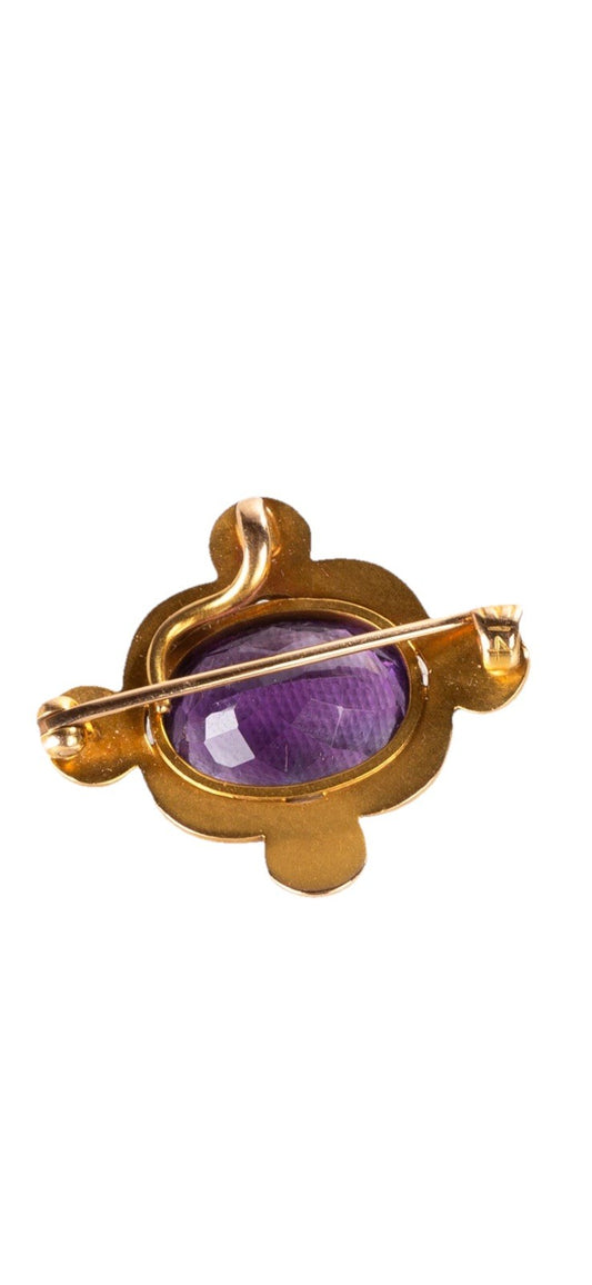 ANTIQUE • Art Nouveau 18k Yellow Gold Buffed Top Amethyst Scroll Frame Brooch