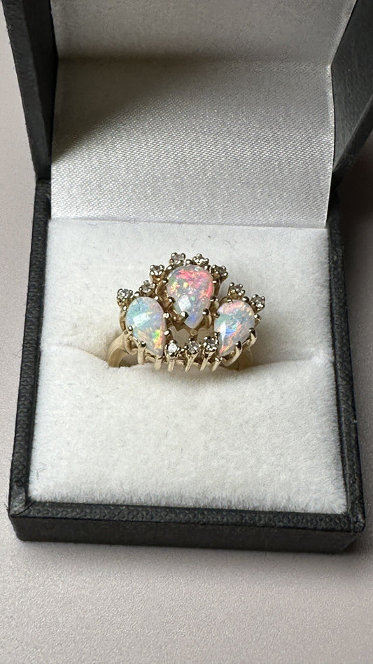 Vintage Three Opals W/Diamond Halo 14k Yellow gold ring