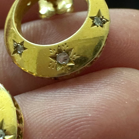 Crescent French Ruby Diamond Earrings star-studded pink sapphire and rose cut diamonds 18k