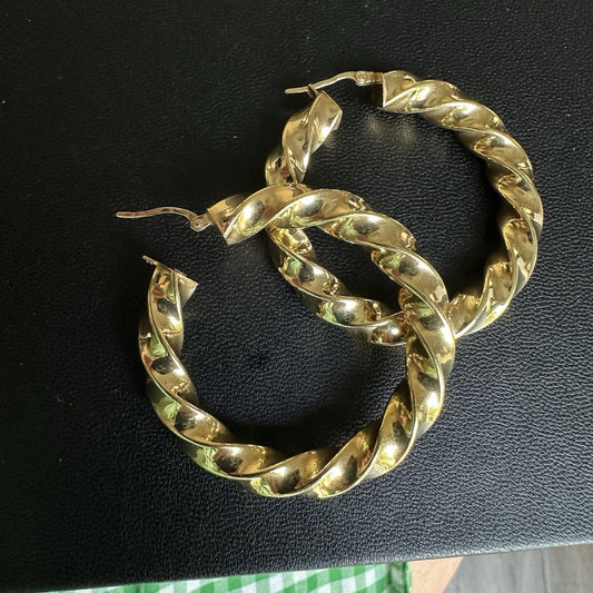 14K Yellow Gold Twisty 1.75 Inch Hoop Earrings 9.45g