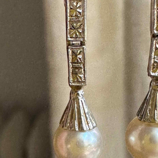 Antique Art Deco 18k White Gold pearl emerald and diamond dangle earrings