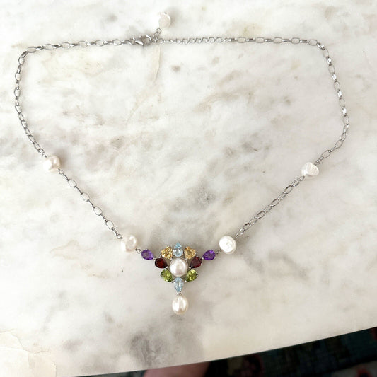Multi Gem Cluster Necklace 14k