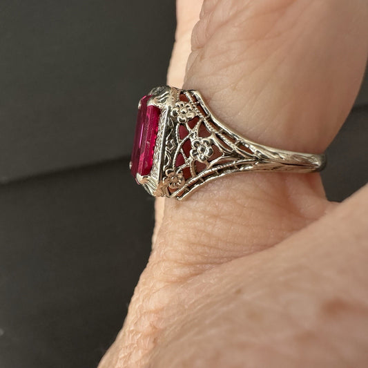 Art Deco 14k Gold Filigree Lab Ruby Ring 2.3g Size 6.5