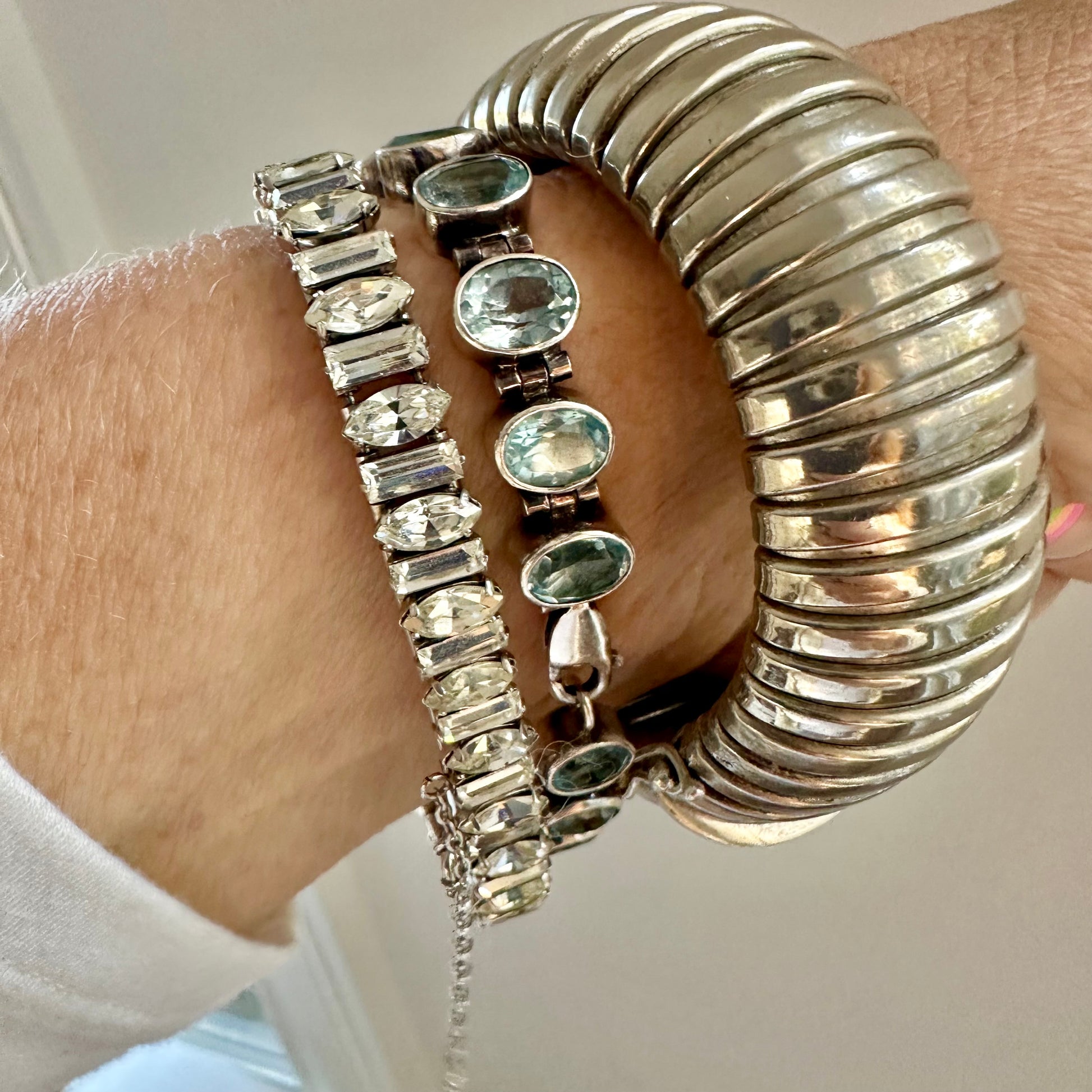 Beautifully made sterling silver with bezeled blue topaz stones the entire bracelet length.