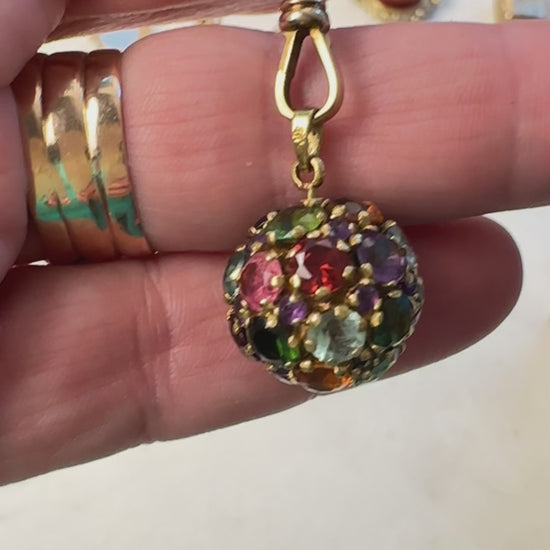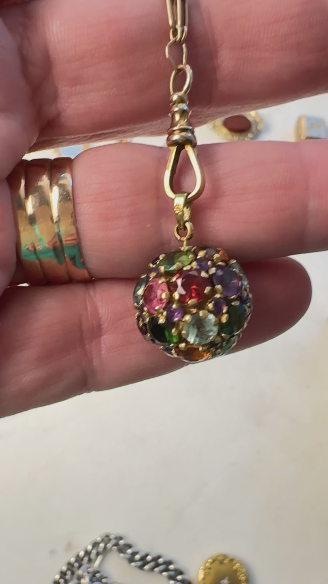The chain with bezel-set aquamarines and pearls, suspending a later 18k gold gem-set ball charm, set with circular-cut multicolored gemstones including garnet, tourmaline, aquamarine, amethyst, and citrine