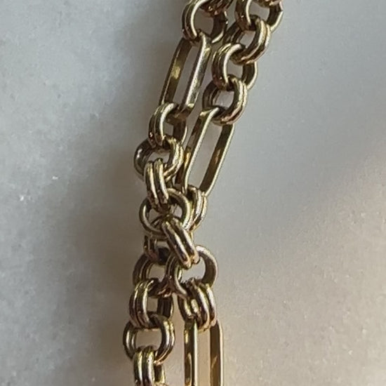 This exquisite antique chain is crafted in glowing 9K yellow gold and features a striking combination of rounded rolo (belcher) links alternating with elongated rectangular bar links. The design gives the chain both strength and elegance, making it a versatile piece that can be worn alone, layered, or paired with a locket, pendant, or fob.