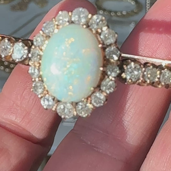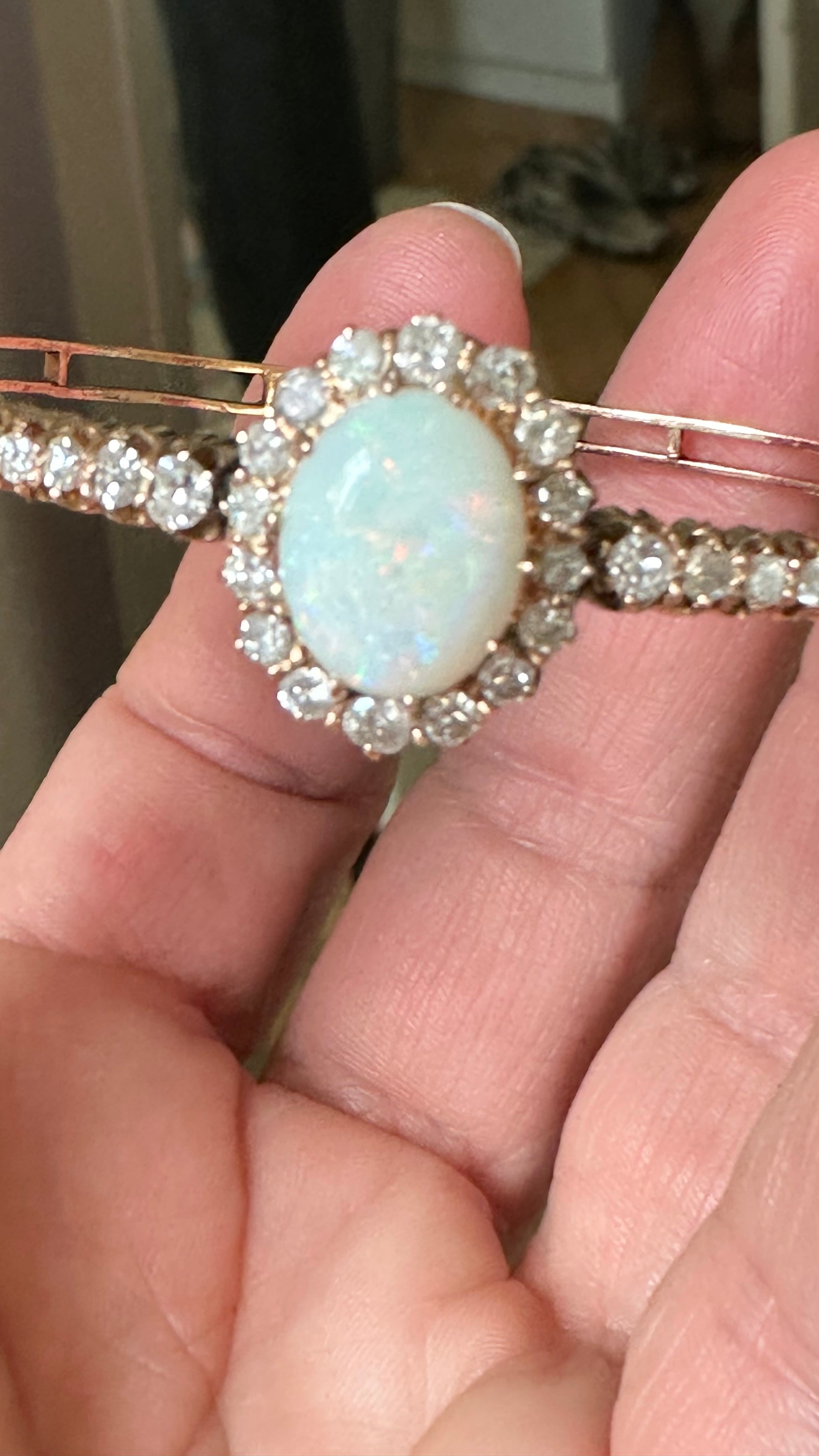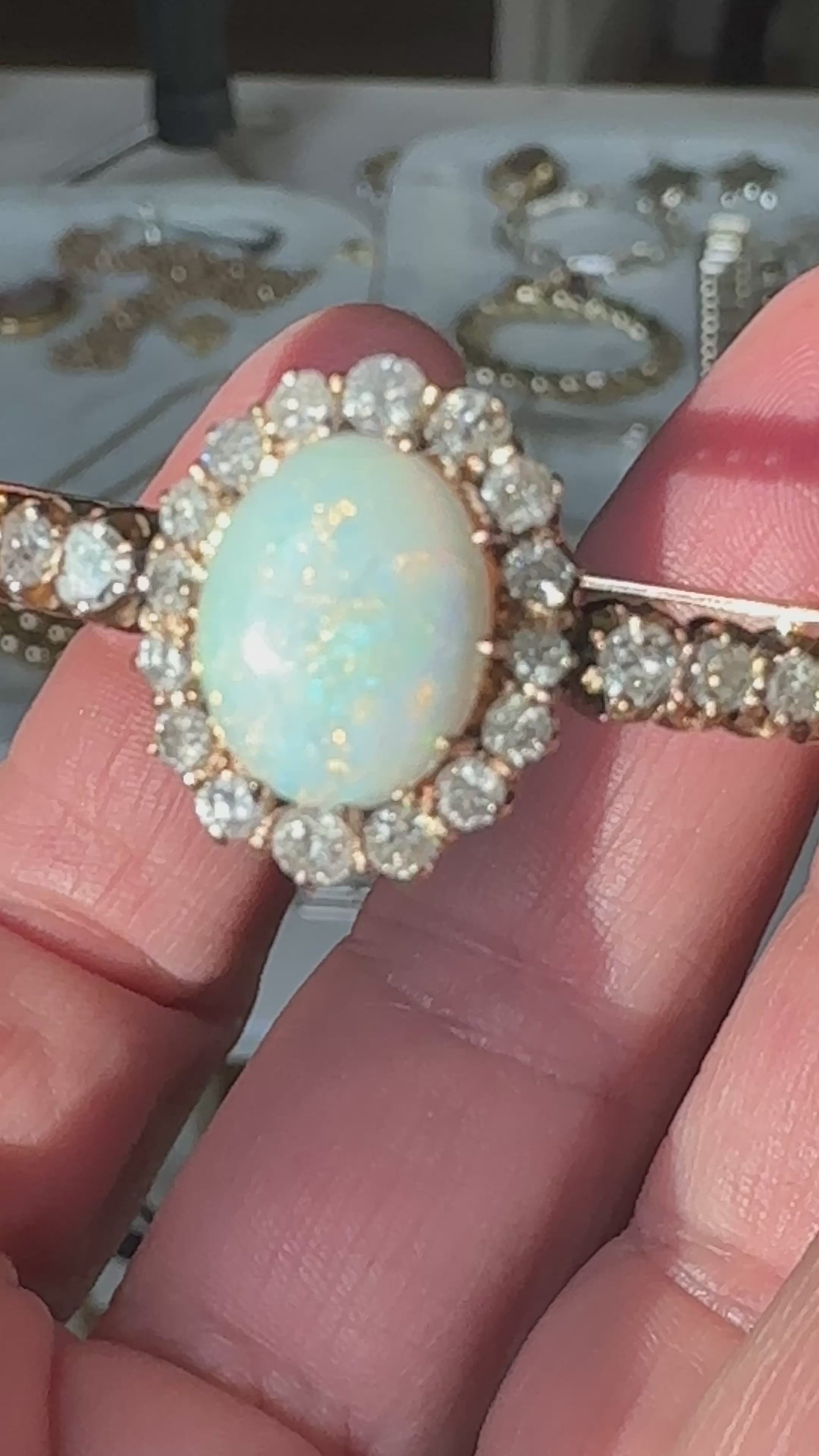 The hinged bangle set with an oval cabochon opal measuring approximately 11.50 x 9.10 x 3.00 mm, framed by full and single-cut old European diamonds, approximate total diamond weight 2 carats,