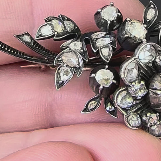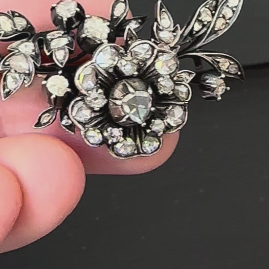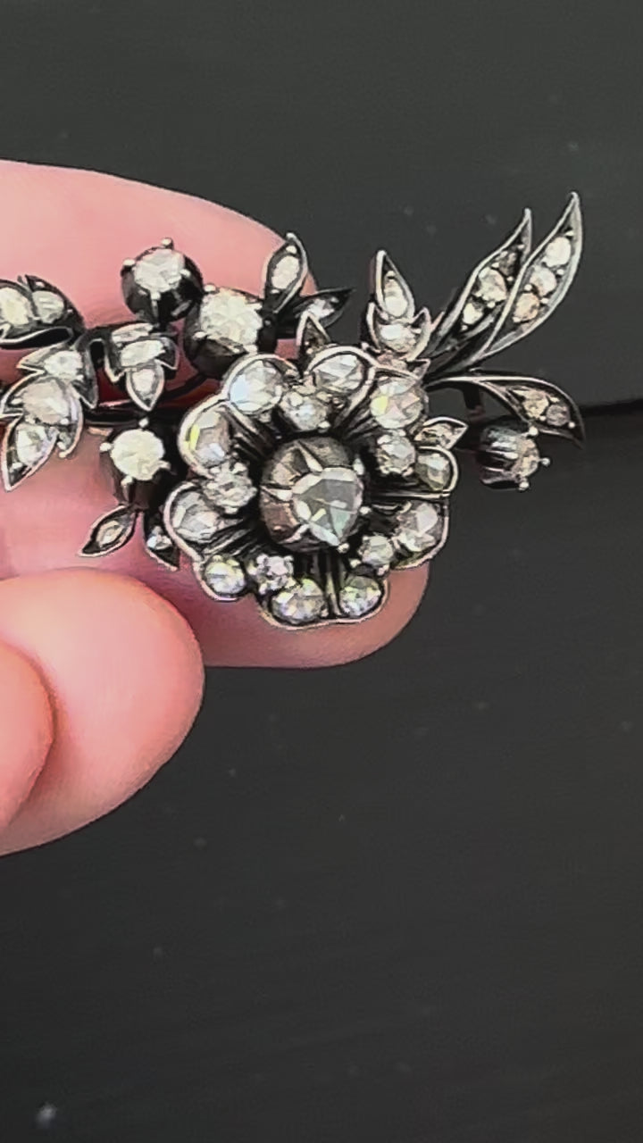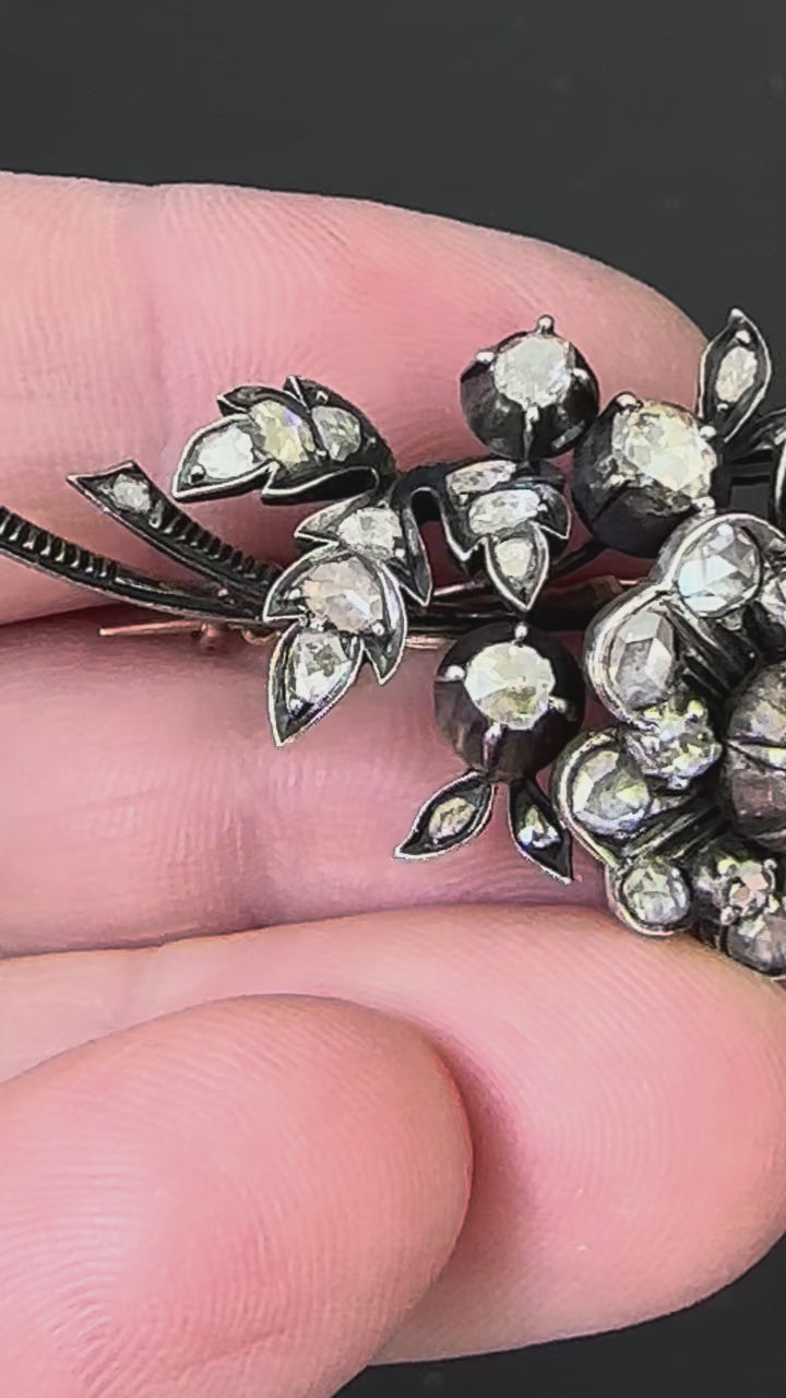 Elevate your jewelry collection with the timeless elegance of this Antique Silver Topped Gold Brooch. Featuring a stunning array of white/colorless diamonds with a rose cut, the piece blooms into a flower shape that exudes classic charm. Each diamond contributes to the overall sparkle, set against the warm glow of the 900 & 13k gold base.
