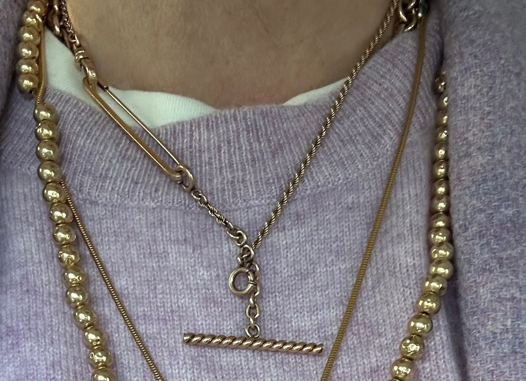Victorian era with this exquisite 10k rosey gold watch chain, complete with a dog clip and Albert bar.