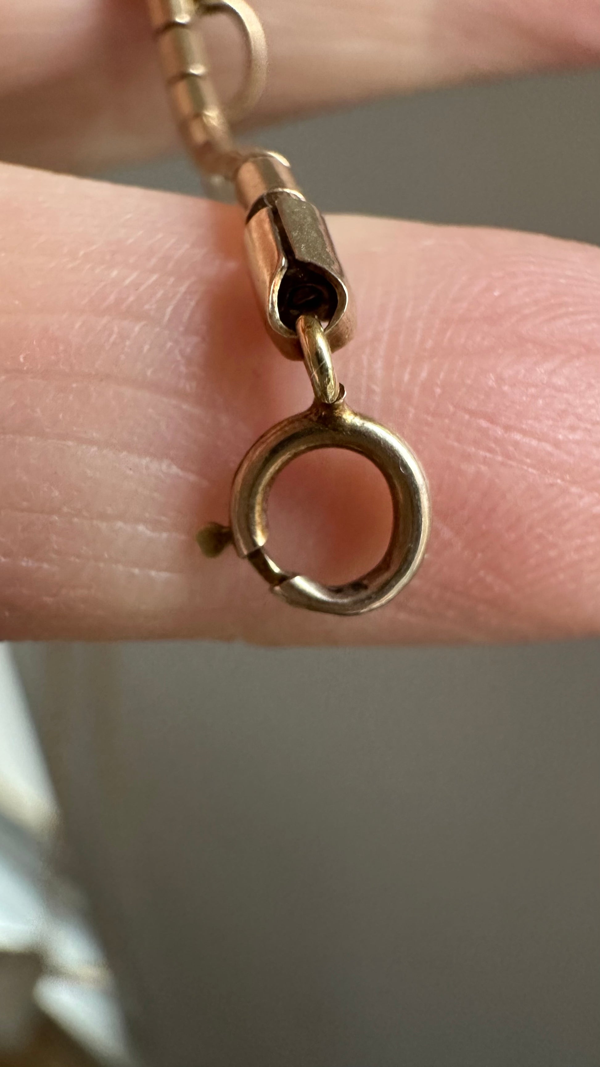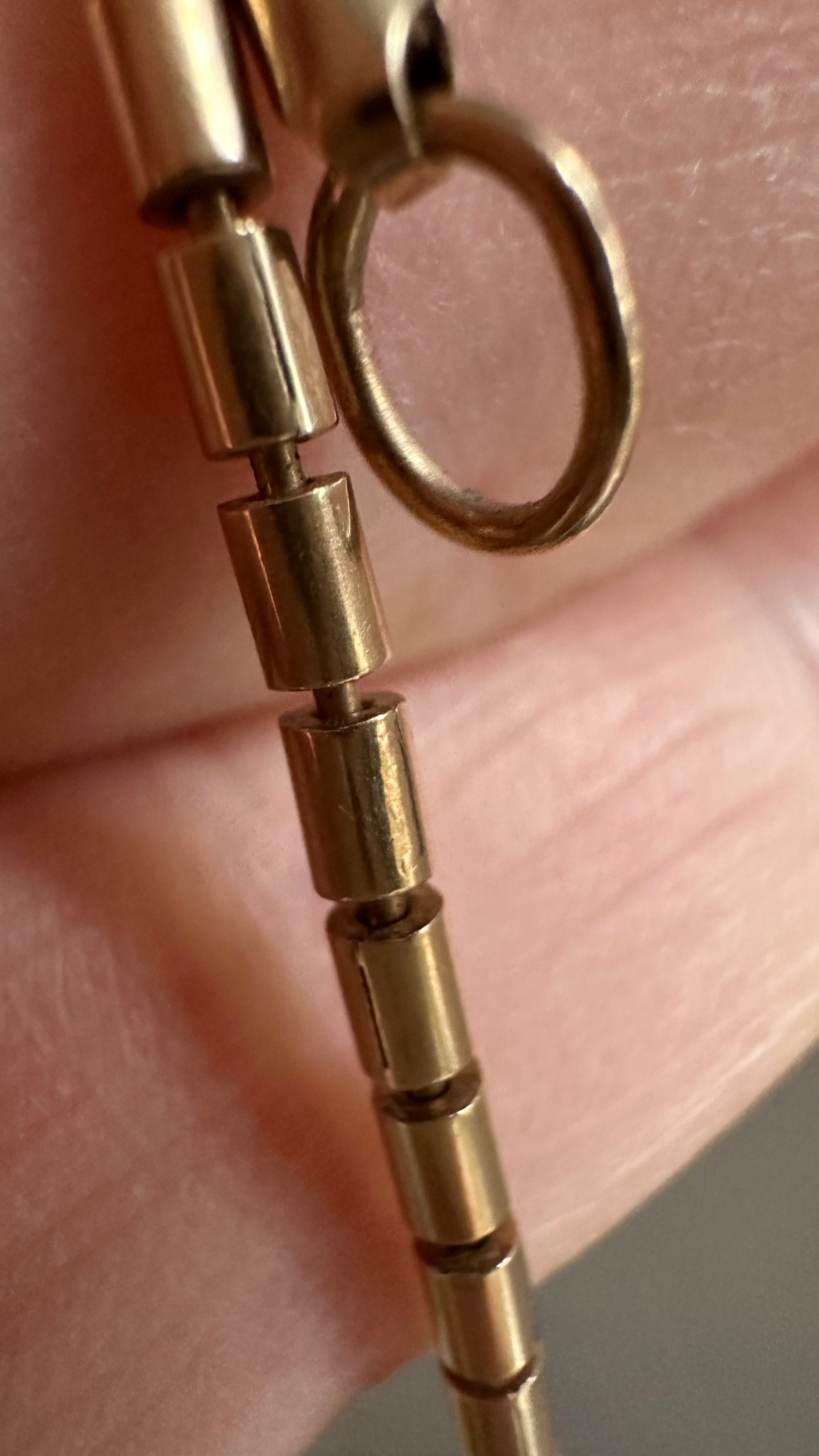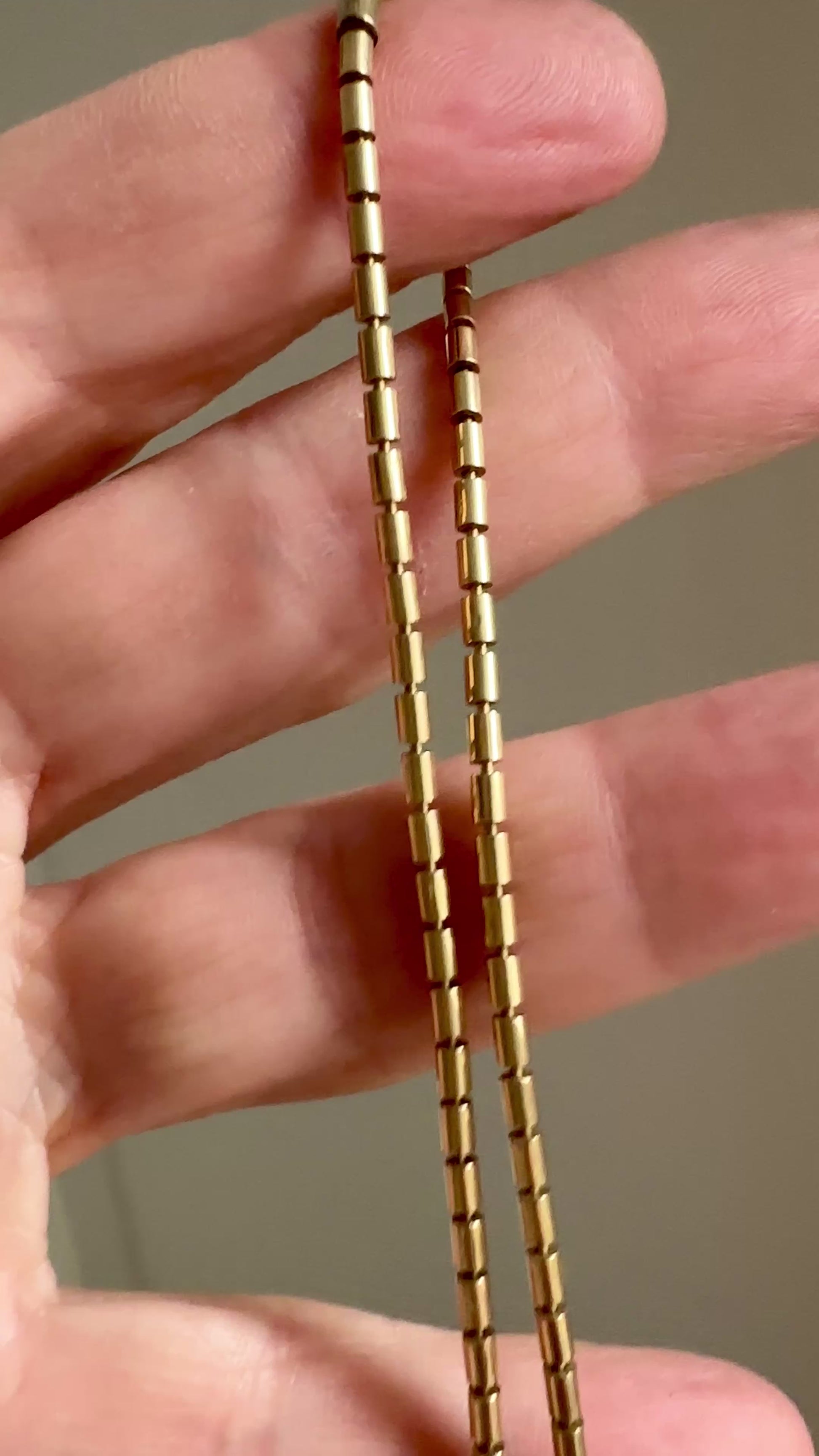 Exceptionally smooth and fluid, this antique barrel-link (tubular) chain glides beautifully in the hand and on the neck. Crafted in solid 14K gold, each cylindrical link is perfectly proportioned and threaded for flexibility, creating that unmistakable antique feel modern chains just don’t replicate.