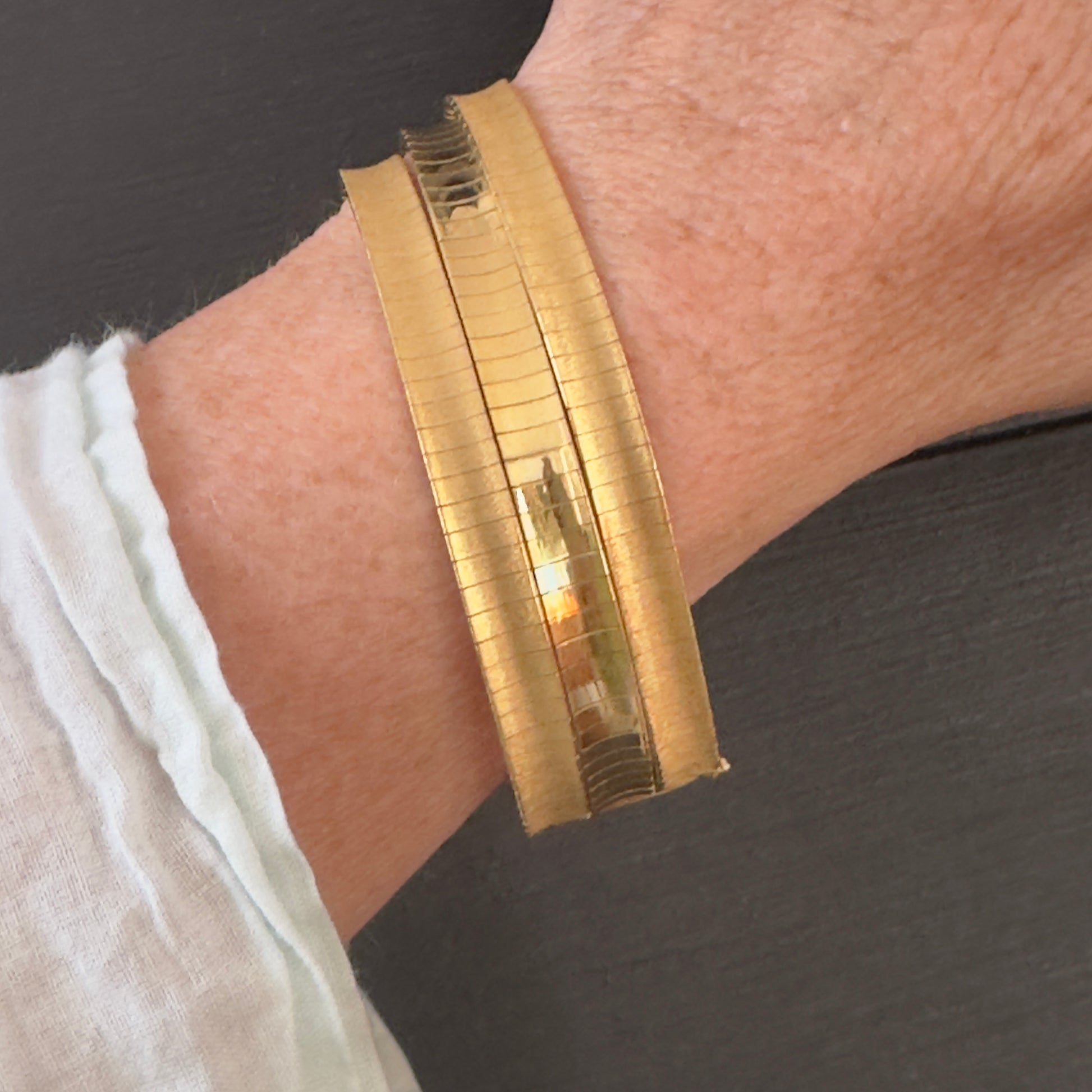 Gorgeous hue of 18k Italian yellow gold gloss bracelet. Three strands of of textured gold links. The epitome of Italian glamour. Hailing from the 80s is this generous sized bracelet in beautiful 18k Italian Gold. A stunning buttery vintage gold with full Italian hallmarks and the most standout statement vintage push clasp with a figure 8 fastener - this bracelet is so luxe even words cannot do it justice.