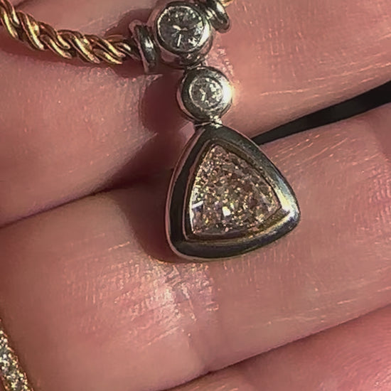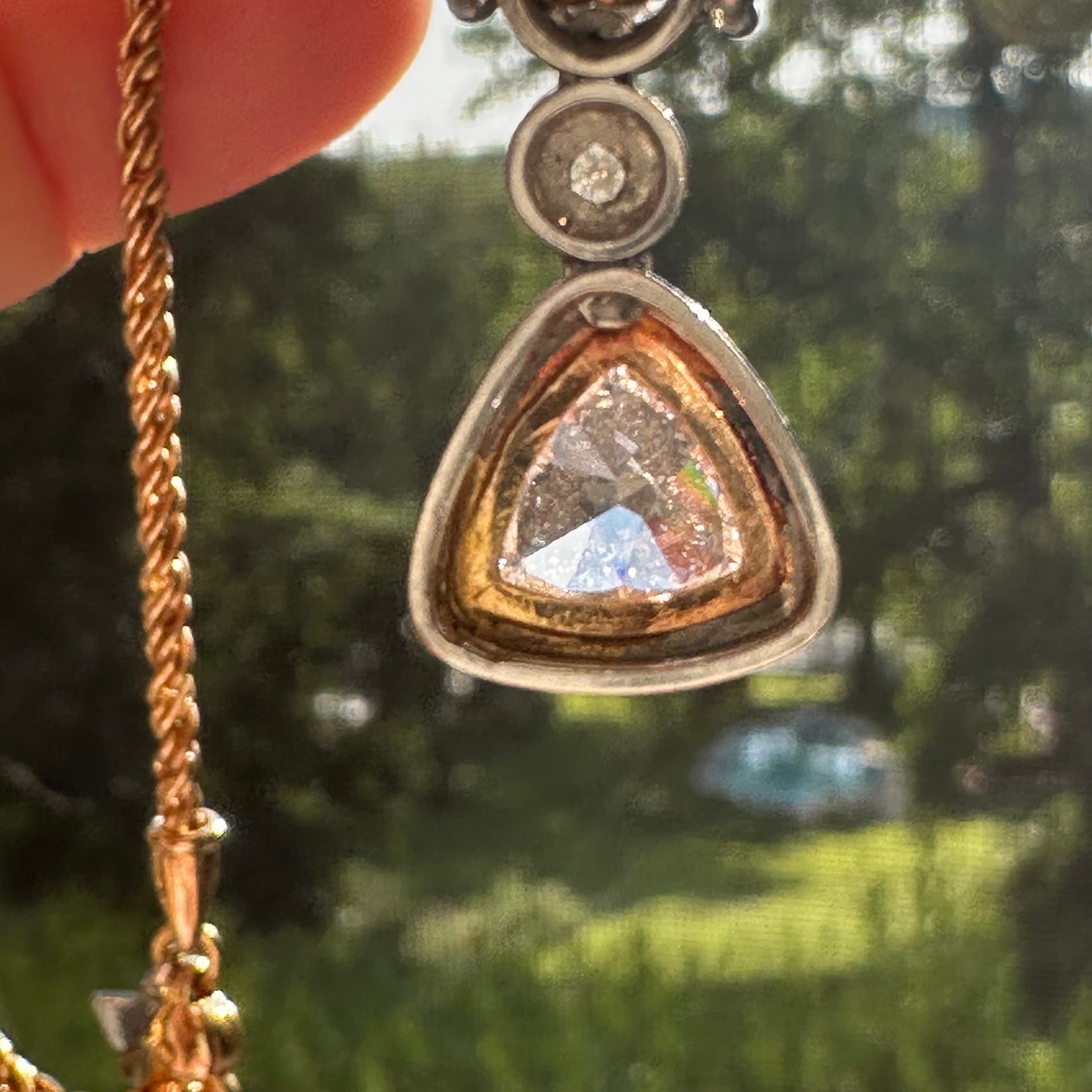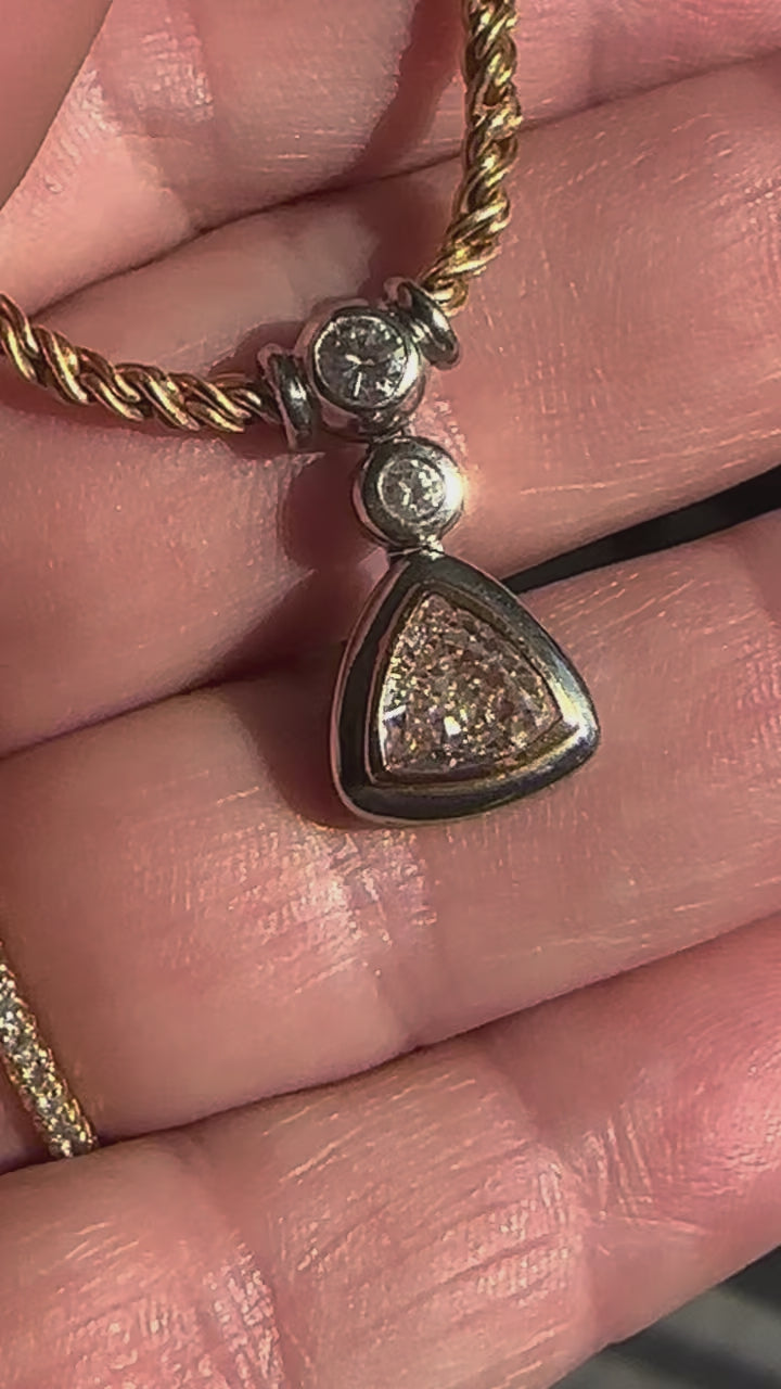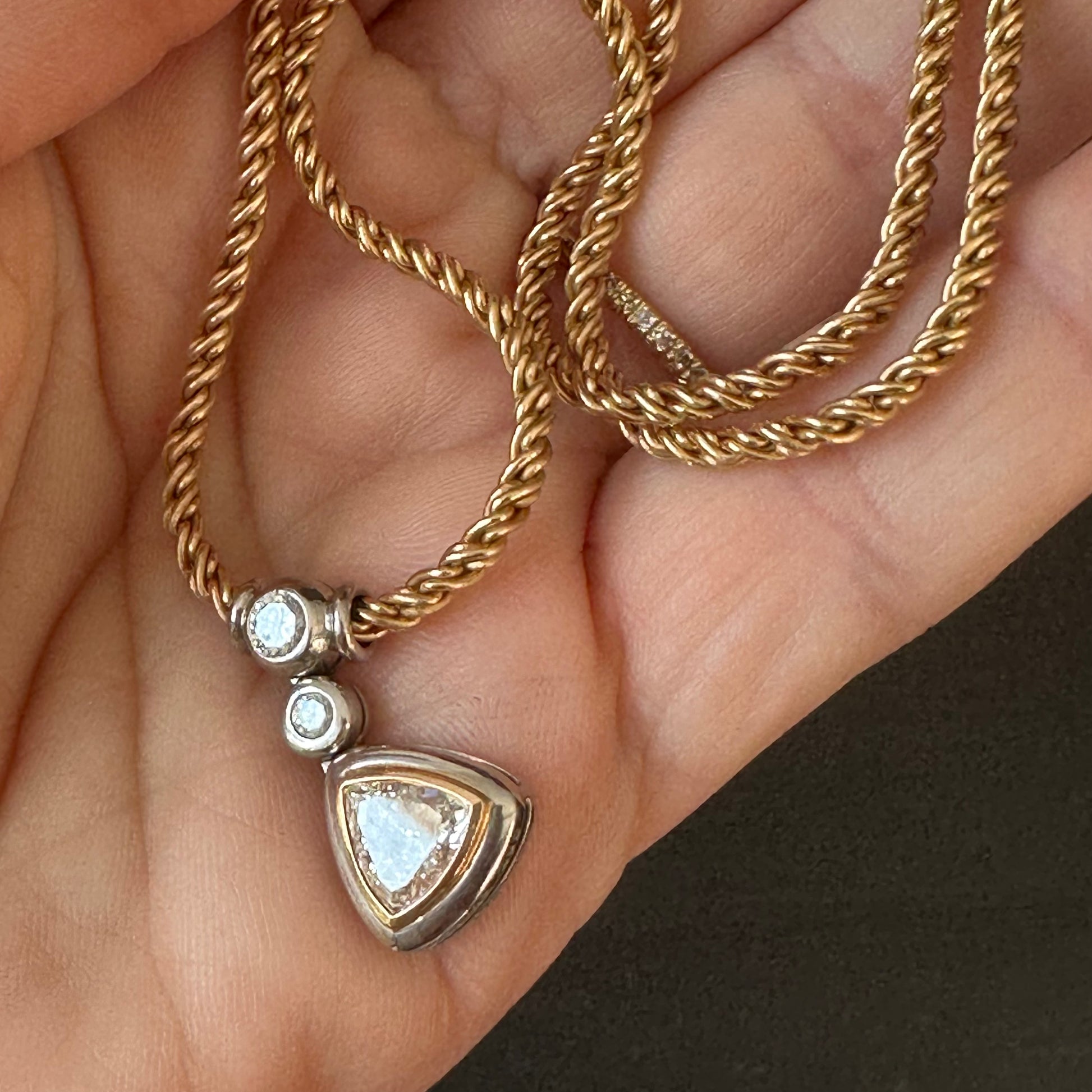 A movable pendant featuring a trillion-cut diamond weighing approximately 1.00 carat bezel-set in rose gold and round diamond accents, suspended from a fancy link chain, with maker's mark, with English hallmarks, with signed box,