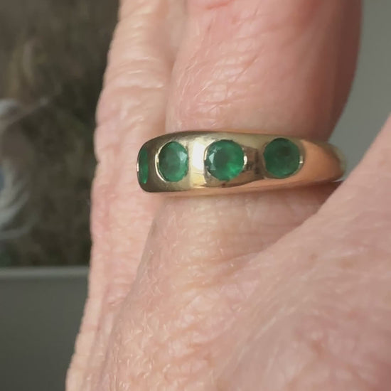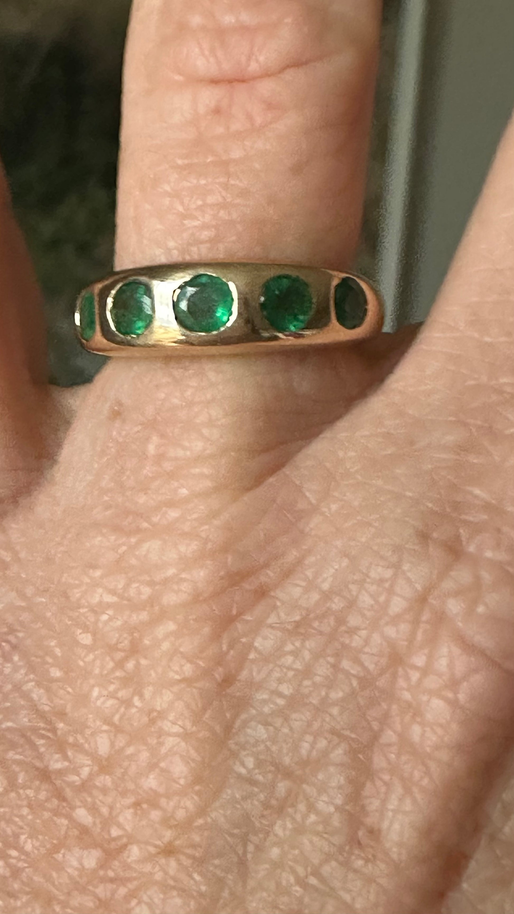 Iconic vintage 14k natural emerald five stone doughnut style gypsy ring over 3.5 carat total weight.