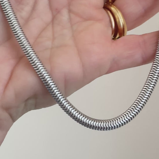The Vintage Sterling Snake Necklace features a mid-century modern design with a width of 5.8 mm and an adjustable length between 16.5 to 17 inches. Its sleek and slinky form enhances elegance, making it a versatile accessory for various occasions. The necklace's beautiful condition ensures a lasting addition to any jewelry collection.