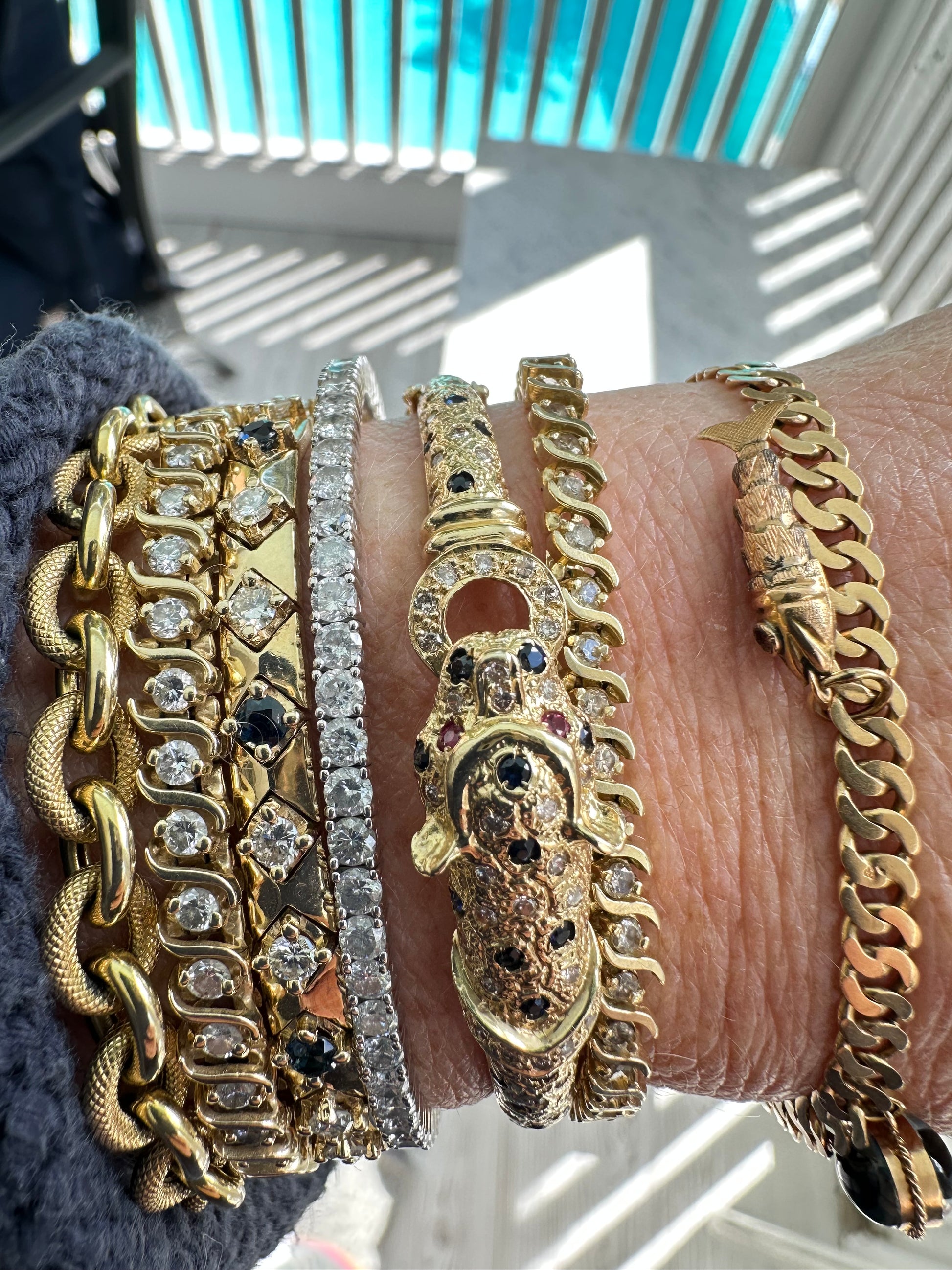 VINTAGE YELLOW GOLD AND GEMSTONE PANTHER BANGLE BRACELET